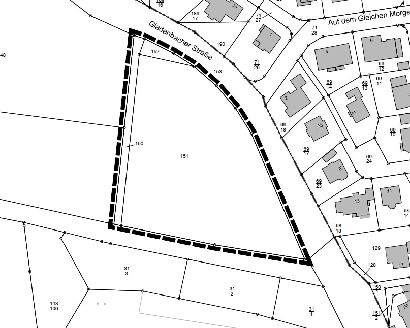 (2) Der Geltungsbereich des Bebauungsplanes sowie der FNP-Änderung ist der nachfolgenden Übersichtskarte zu entnehmen und umfasst in der Flur 1, die Flurstücke 150 – 152. Alle Flurstücke liegen in der Gemarkung Fronhausen. Das Plangebiet liegt, getrennt durch die Gladenbacher Straße, nordwestlich der Ortslage Fronhausen bzw. gegenüber dem Wohngebiet Auf dem gleichen Morgen.