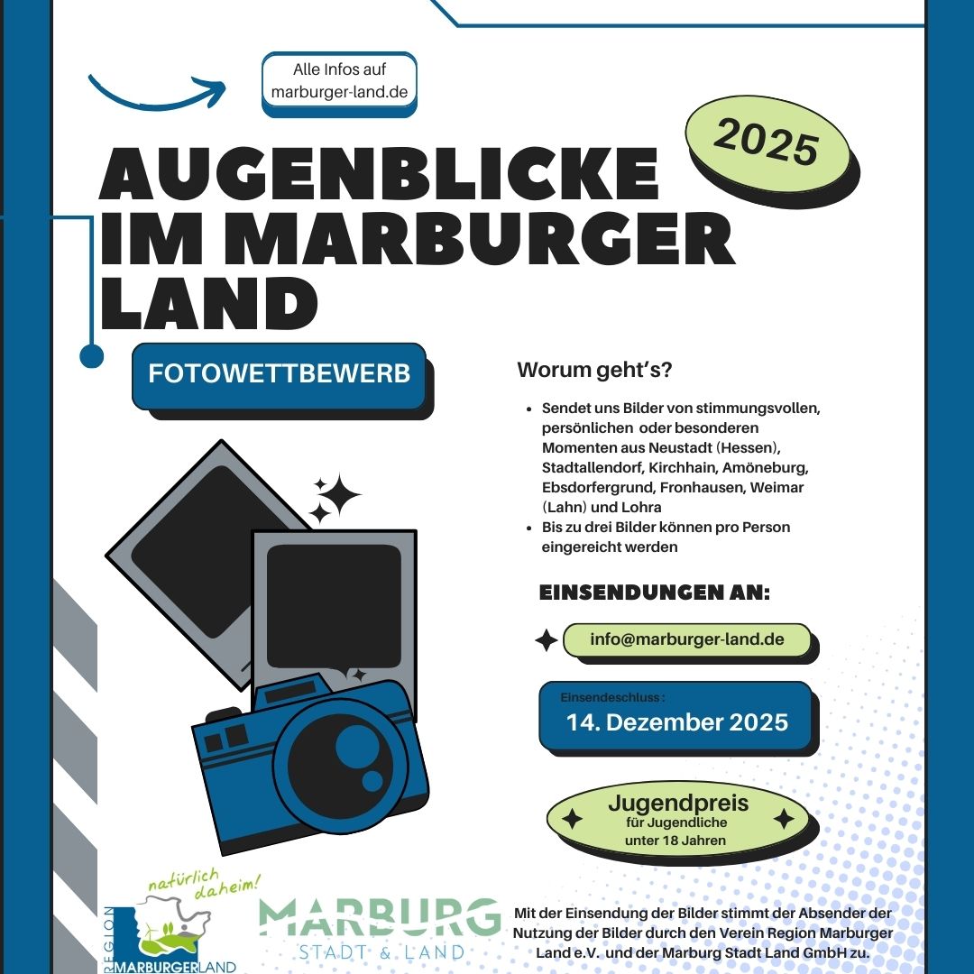 Ob Natur, Kultur oder besondere Momente im Alltag – die Region Marburger Land steckt voller einzigartiger Eindrücke. Unter dem Motto „Augenblicke im Marburger Land“ lädt die Region alle Bürgerinnen und Bürger ein, ihre schönsten Fotos einzureichen. Gesucht werden Bilder, die besondere Augenblicke in unserer Heimat einfangen – ob landschaftliche Impressionen, kleine Details am Wegesrand oder besondere Situationen, die das Leben im Marburger Land widerspiegeln.