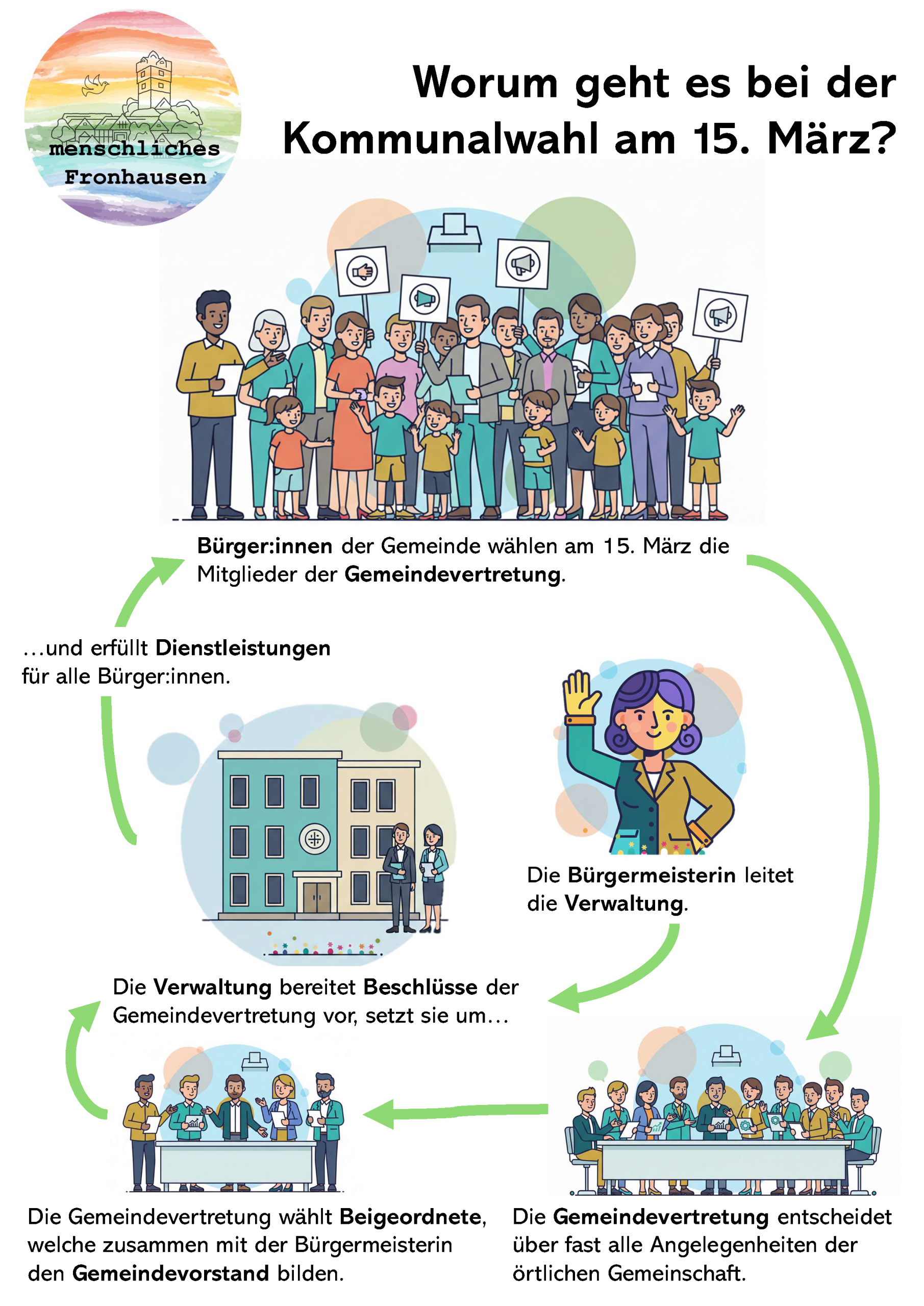 Die folgende Infografik soll anhand des Beispiels zur Wahl zur Gemeindevertretung darstellen, worum es bei der Kommunalwahl geht: