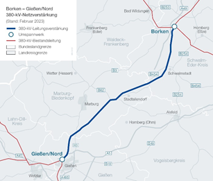 Die bestehende 380-kV-Höchstspannungsleitung zwischen den Umspannwerken Borken und Gießen/Nord soll durch den Tausch der Leiterseile mit leistungsfähigeren Hochtemperaturleiterseilen verstärkt werden. Dieser Leiterseiltausch ist eine Komponente umfangreicher Sanierungsarbeiten, die vor fünf Jahren mit der Erneuerung der Isolatoren begonnen haben. Seit dem letzten Jahr finden Sanierungsarbeiten an den Masten statt (Stahlsanierung). Ziel dieser „Netzverstärkung“ ist es, die Leistungsfähigkeit des Stromnetzes und die Übertragungskapazität zu erhöhen und im Rahmen der Energiewende zum Abtransport der erzeugten Windenergie aus der Region auf 110-kV Ebene, auf 380kV-Ebene beizutragen.