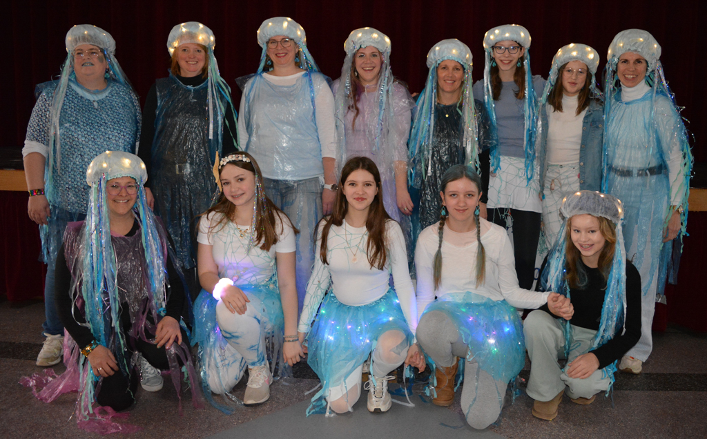 Zum abschließenden Höhepunkt positionierte sich das Orga-Team samt Jugendlichen Helfern, die zu dem Motto „Unterwasserwelten“ kostümiert waren, auf der Bühne. Jetzt wurden Kamelle in die Kindermenge geworfen und sich damit von den rund 400 Gästen verabschiedet.