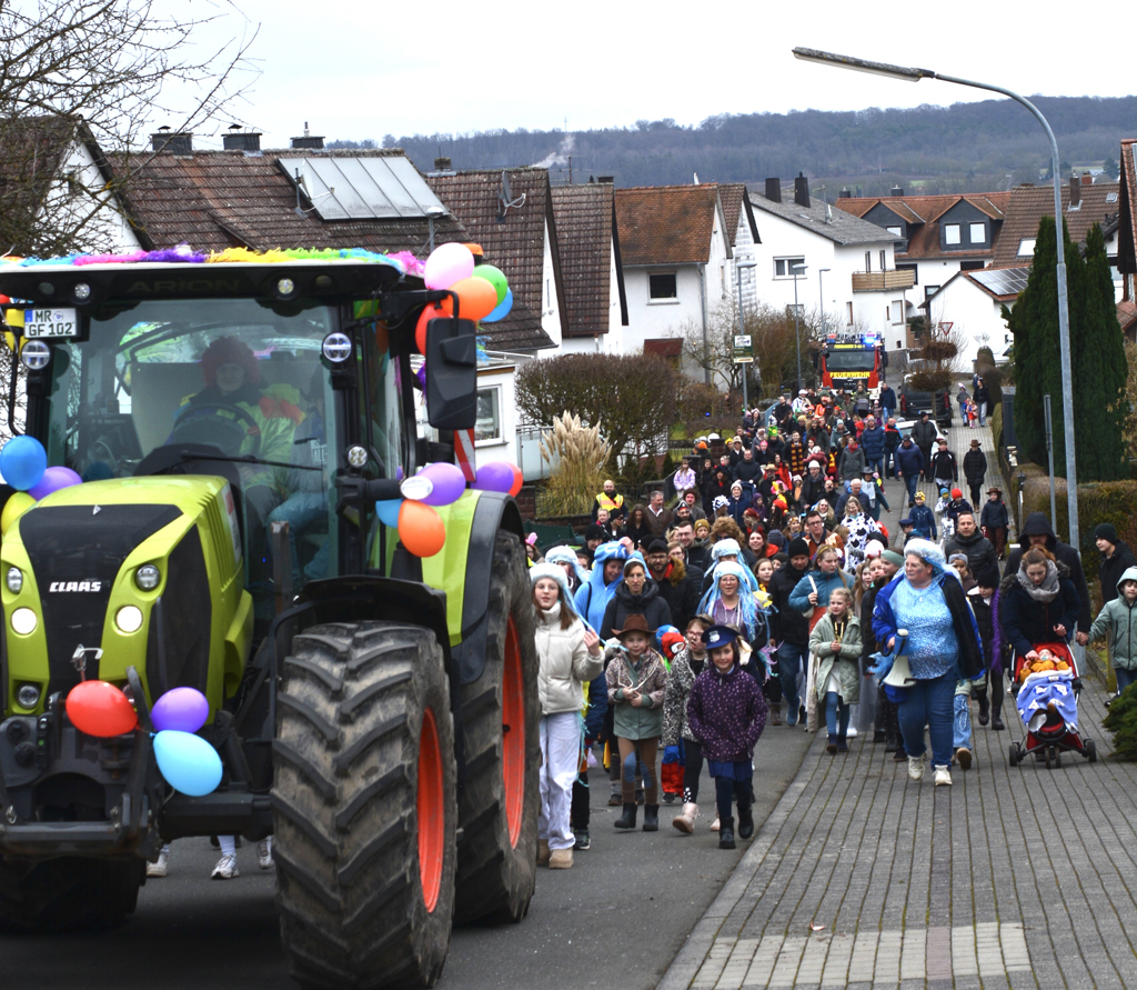 Herausgekommen ist eine tolle Veranstaltung, die am Faschingssamstag um 13.11 Uhr mit einem Straßenumzug durch den Ort startete. Angeführt von einem geschmückten Schlepper, Musik und Helaurufen zog eine gut gelaunte Menge in originellen Kostümen durch die Straßen in das Bürgerhaus.
