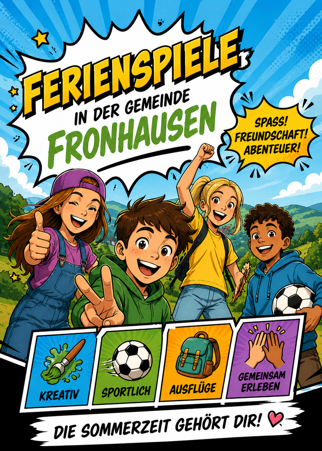 in der Zeit vom 29.06.2026 bis 17.07.2026 finden die Ferienspiele für die 6 – 13-jährigen der Gemeinde Fronhausen statt.